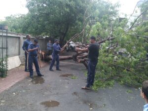તેમજ રાજકોટ શહેરના જુદા જુદા વિસ્તારમા જેમકે (૧) લક્ષ્મીનગર (૨) ગુણાતીતનગર (૩) ડી માર્ટની બાજુમા કુવાડવા રોડ (૪) પવનપુત્ર ચોક સોરઠીયા વાડી (૫) સુર્યમુખી હનુમાન (૬) આર.એમ.સી કવાટર માર્કેટીંગ (૭) ડોમિનોઝ પિઝા સામે, જયંત કે જી મેઇન રોડ (૮) નાનમવા મેઇન રોડ (૯) કોઠારીયા રોડ (૧૦) પુષકર ધામ (૧૧) હરી ધવા રોડ (૧૨) રૈયા ટેલી. એક્ષ્ચેન્જ (૧૩) રાષ્ટ્રીય શાળા (૧૪) નિલકંઠ પાર્ક (૧૫) માલવીયા કોલેજ (૧૬) અતિથી ચોક (૧૭) ૮૦ ફુટ રોડ ફૌજી પાન (૧૮) વાણીયા વાડી (૧૯) ત્રિવેણી સોસાયટી (૨૦) માધાપર ગામ (૨૧) ગોપાલક ગર્લ્સ હોસ્ટેલ નાનમવા રોડ (૨૨) ગોંડલ રોડ ચોકડી (૨૩) યુનિવર્સીટી રોડ (૨૪) પોપટપરા મેઇન રોડ (૨૫) ક્રિસ્ટલ મોલની પાછળ (૨૬) એ જી સોસાયટી (૨૭) સરિતા વિહાર (૨૮) માધાપર (૨૯) વિમલનગર મેઇન રોડ (૩૦) પુષ્કર ધામ મેઇન રોડ (૩૧) નીલ સીટી (૩૨) વિષ્ણૂ વિહાર સોસાયટી (૩૩) નાનમવા સર્કલ (૩૪) ઘનશ્યામ નગર (૩૫) જનકપુરી કુલ – ૩૫ જગ્યાએ જે તે વિસ્તારના સ્ટેશન ઓફીસરની ટીમ દ્વારા પડી ગયેલ ઝાડને ખસેડી માર્ગ ખુલ્લા કરવામા આવેલ, આ કામગીરી ચીફ ફાયર ઓફીસર આઇ. વી. ખેર અને ડે.ચીફ ફાયર ઓફીસર શ્રી બી. જે. ઠેબાના સુપરવિઝન હેઠળ ઉપરોકત કામગીરી કરવામા આવેલ.